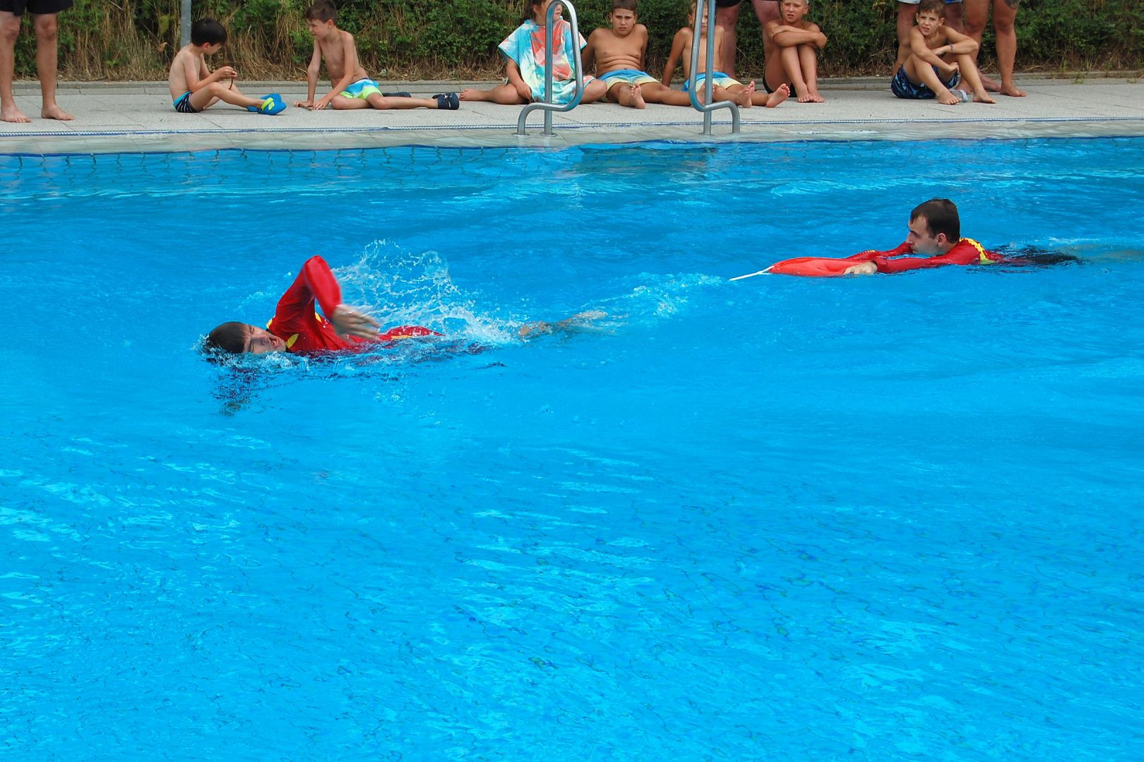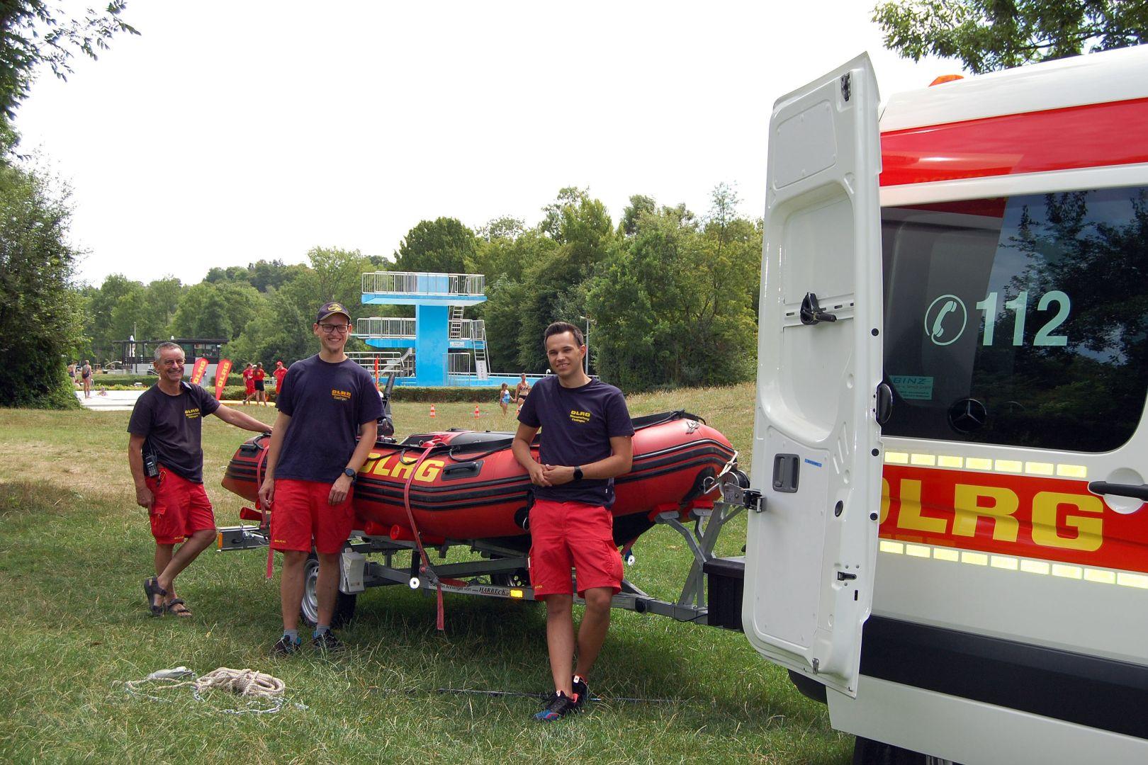 Präsentation Wasserrettungsfahrzeug Am 23.07 waren Mitglieder der DLRG Ortsgruppe Ostfildern-Denkendorf mit einem Fahrzeug des Wasserrettungszuges des Bezirkes Esslingen mit Besatzung im Freibad. Wir konnten bei einer Vorführung im Springerbecken verschiedene Rettungsgeräte zeigen und vorführen, wie eine Rettung einer Person ablaufen kann. Unter anderem wurde auch die Handhabung unseres neuen Rettungsbrettes demonstriert. Nach den Vorführungen konnten sich die interessierten Badegäste an verschiedenen Stationen selbst einen Eindruck von der Handhabung von Wurfsack und Rettungsball verschaffen. Das Einsatzfahrzeug mit Rettungsboot fand großes Interesse und wir konnten viele Fragen der interessierten Gäste über unsere ehrenamtliche Tätigkeit im Wasserrettungsdienst beantworten. Wir danken allen Helfern und den interessierten Badegästen für das rege Interesse. Ihre Leitung Einsatz der Ortsgruppe Ostfildern Denkendorf.